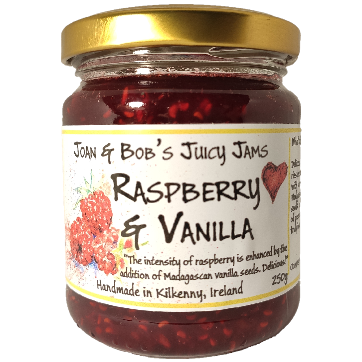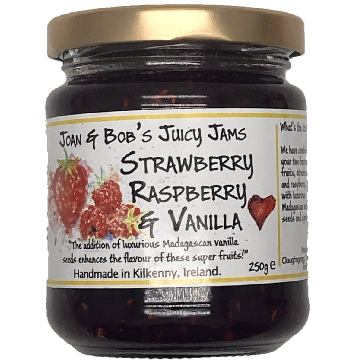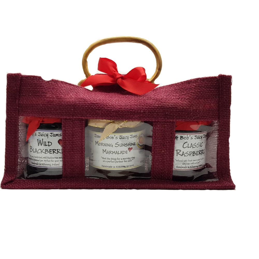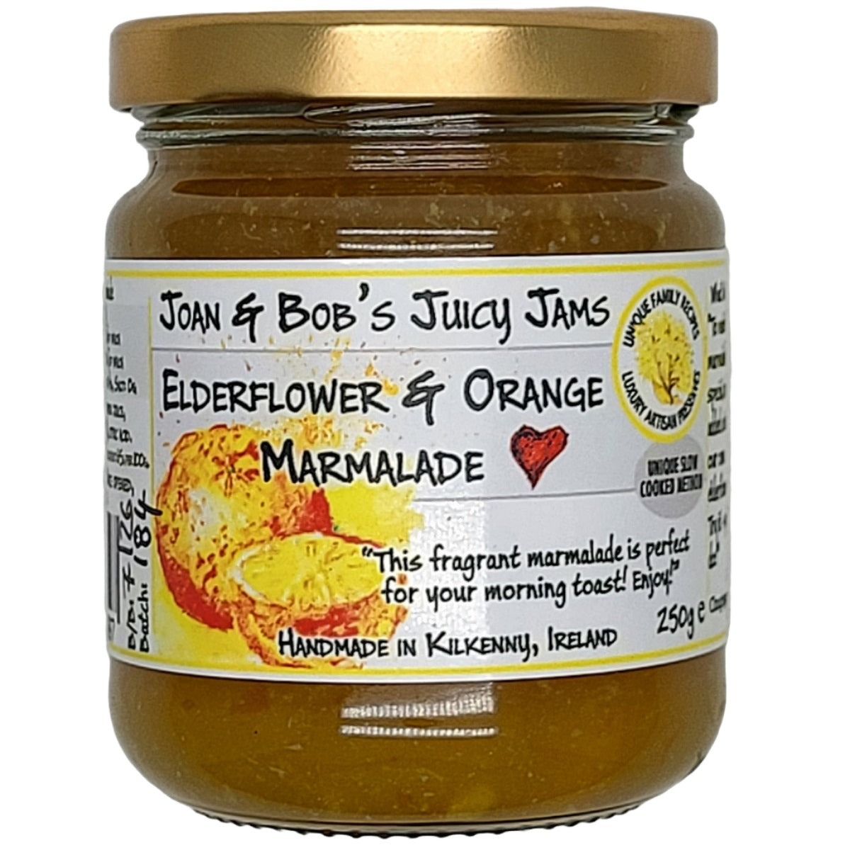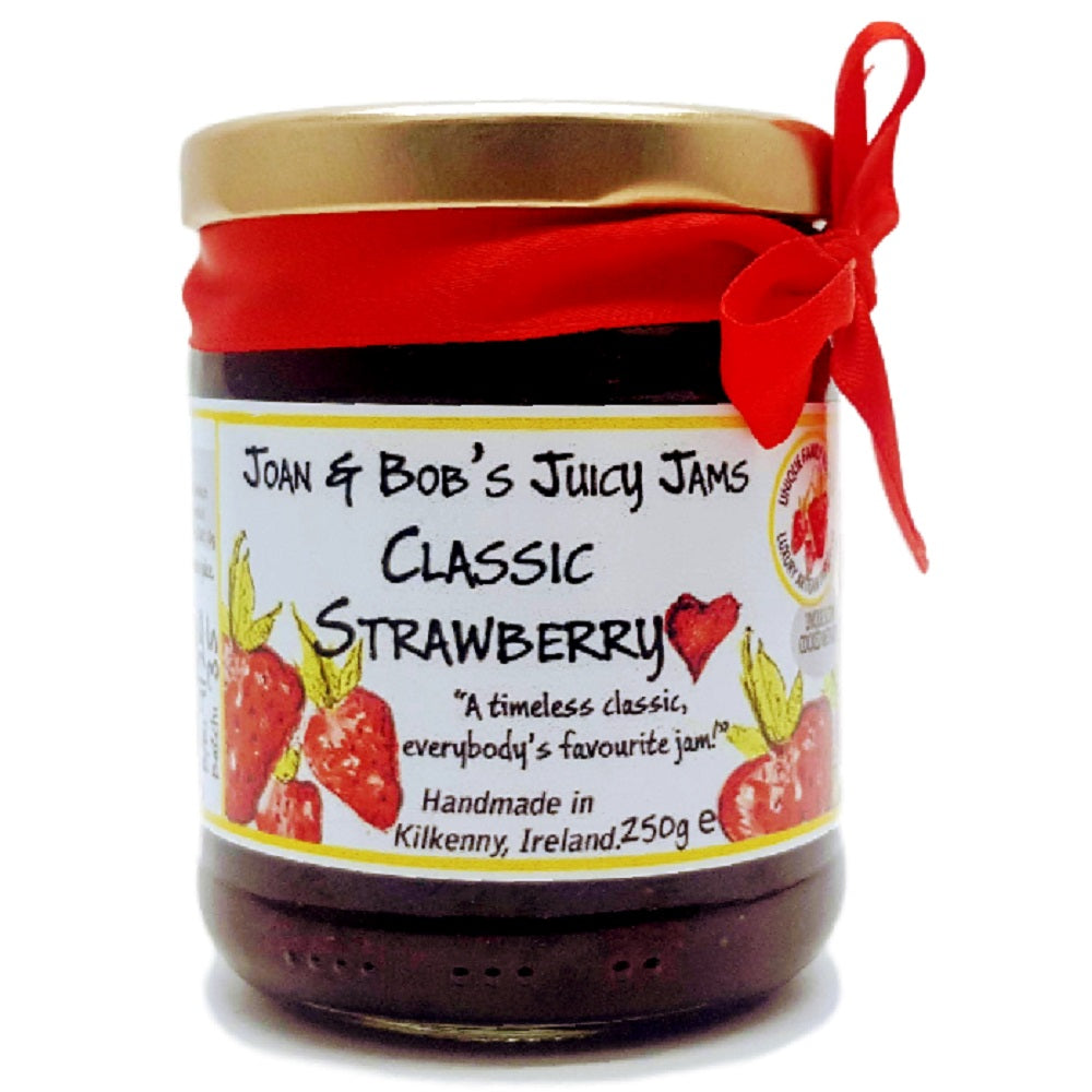 The recession in Ireland seems to have had one positive effect….a new generation of artisan producers have emerged. Joan & Bob Fitzgerald Cahill are one such couple, who, when both lost their jobs in 2011, looked around and realised they had the skills and provisions to make a living doing something they loved in their own home. They had always dabbled with preserving, making jams, jellies, chutneys, ciders, beer wine and even champagne….Joan & Bobs Juicy Jams was born. The preserves are handmade in small batches using seasonal fruit. The wild berries are handpicked by themselves and they use only the natural pectin of the fruit to set the jams. Creative recipes with exciting flavour combinations result in blends like Wild Blackberry, Elderberry & Pinot Noir, which make your taste buds stand up and shout for joy!