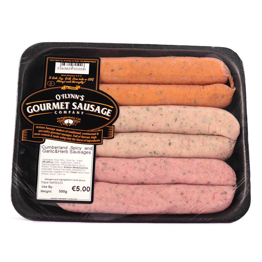 “Since our great-grandfather started making sausages in Cork we’ve been improving and building on old family recipes; always using the best locally sourced ingredients from the Munster region.” Our friends at O ‘Flynn’s love artisan gourmet sausages and have spent years handcrafting the perfect one or ten! All sausages have a minimum of 75% meat content and all of that meat is sourced from butchers in Cork and Waterford. We sell their Irish Traditional Breakfast, Cumberland, Pork & Leek, Sweet Italian and Garlic & Herb sausages as well as their Gourmet Selection.