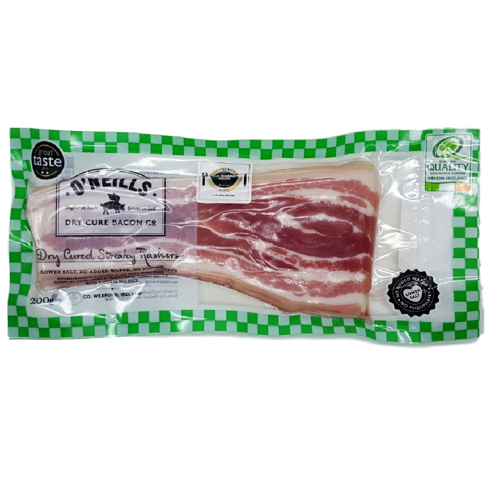 O’Neill’s Dry Cure Bacon Co. pride themselves on producing bacon that tastes and cooks like it should. The multi award winning product range, which is produced in Co. Wexford using Irish pork, includes dry cured rashers, streaky rashers, ham fillets, bacon lardons and bacon loins. Pat O’Neill is the man behind the scene; Pat cures the bacon by hand using a traditional family recipe with a mix of natural sea salt and sugar.  With O’Neill’s you get all meat, so when the bacon is cooking there is no shrinking on the pan. O’Neill’s Dry Cured Bacon Co. has won numerous prestigious awards including the multiple Great Taste Awards, Georgina Campbells Irish Breakfast Award 2017, the Food Writers Guild award, is highly acclaimed by food critics and is the chosen bacon of many of the top chefs in Ireland.  O’Neills is Bord Bia Approved.