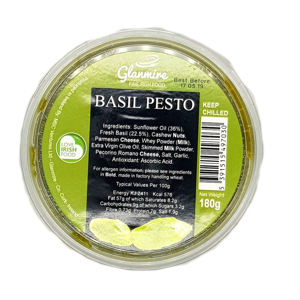 Sunflower Oil (36.8%), Fresh Basil (22.5%), Cashew Nuts, Parmesan Cheese (milk, salt. rennet), Whey Powder (milk), Extra Virgin Olive Oil, Skimmed Milk Powder Pecorino Ramano Cheese, Salt, Garlic, Antioxidant: Ascorbic Acid.