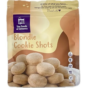 Cookie Shots are small and delicious. The Foods of Athenry Blondie Biscuits are Gluten Free, Wheat Free & Vegan. These bite size crunchy vanilla cookies are the perfect companion for your afternoon cup of tea or coffee and come in a resealable pouch. Perfect. Vanilla shortbread morsels with only 4g and 18 calories per mini cookie