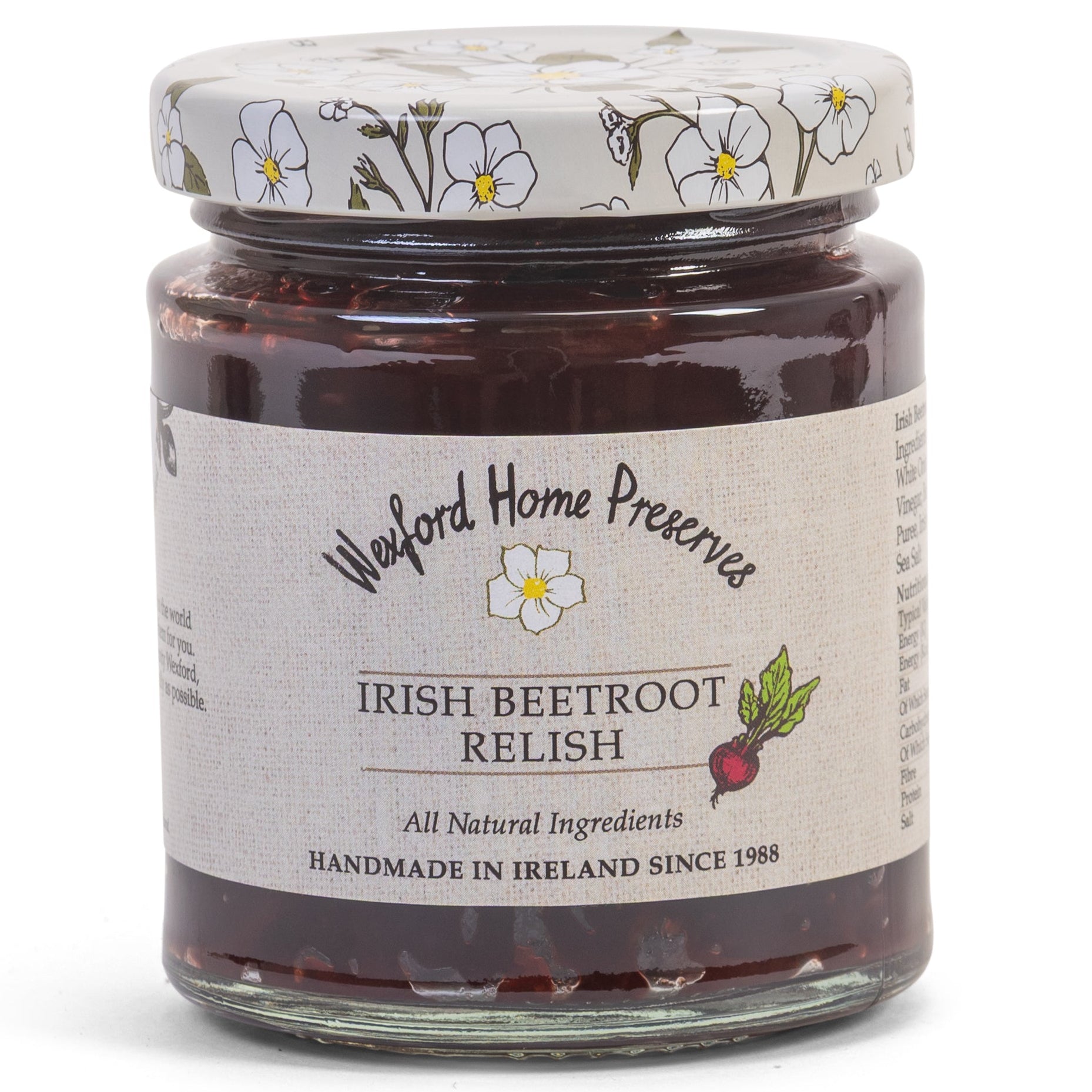 Wexford Home Preserves New Irish Beetroot Relish is made with the finest Irish beetroot and Irish white onions. It has a wonderful earthy flavour and sharp bite to it and works very well in salads, with Feta cheese, or as you please.