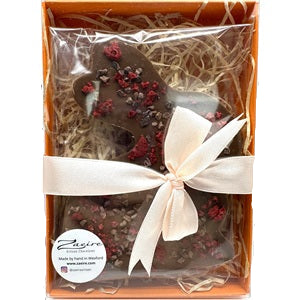 Milk Chocolate "bar like" egg with cacao nibs and freeze dried raspberry.